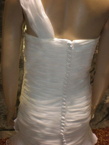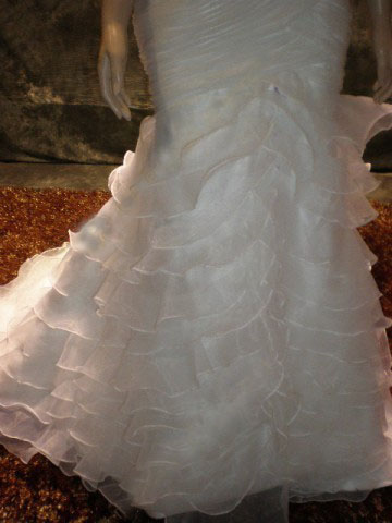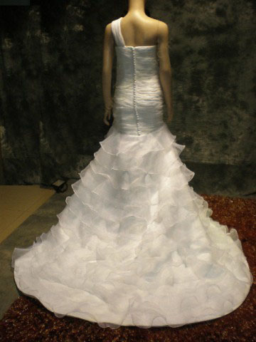 This mermaid style wedding dress features layers of organza with asymmetrical straps.