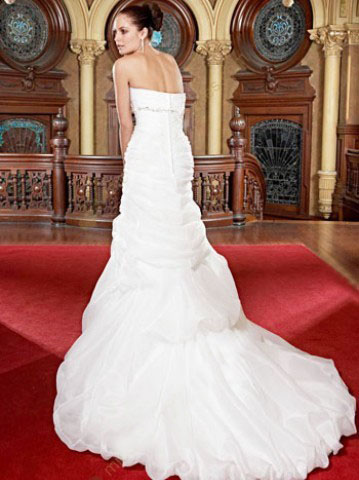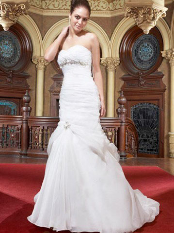 This kind of wedding dress features sweetheart and strapless design, empire waist with inverted beaded waistline,pleated bust,mermaid trumpet silhouette,pongee lining,back zipper closure,made of satin and organza.
