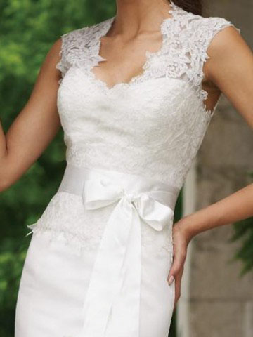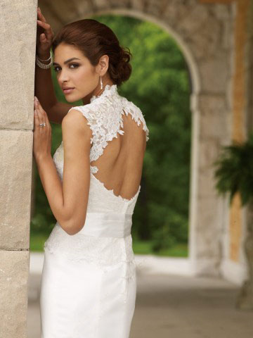 The stunning mermaid satin dress features a lace queen anne neckline with open back bodice which is closed with buttons.