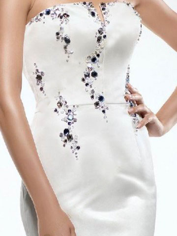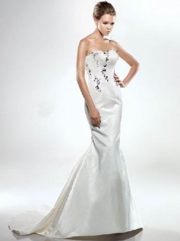 White wedding dress features strapless and mermaid design. Beading and embroidery.