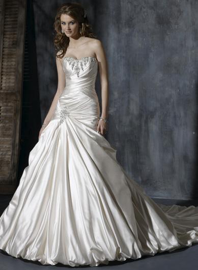 Our fashion style of wedding dress combines all the essence of the traditional beauty and combines the extraordinary modern elements. Fancy silhouette with charming elements creates a fantastic look. Sumptuous wedding dresses appreciate soft neckline dotted with glittering embroidery and beaded motifs over the pleated bodice. Natural waistline reveals the full skirt running down to the floor with a graceful chapel train.