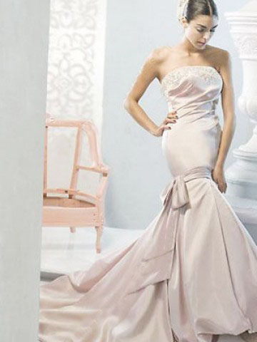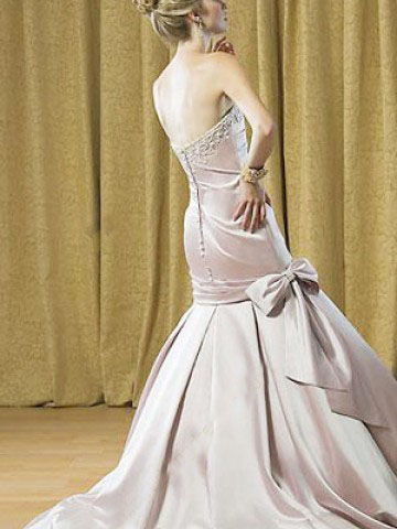 This kind of wedding dress features strapless design with beaded neckline, handmade bow ornaments the dropped waistline,back zippered,pongee lining,mermaid trumpet silhouette, floor length, made of satin.Gloves are included while other accessories are excluded.
