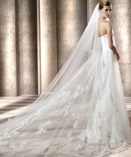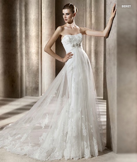 2012 Ivory Antique Lace Bridal Gown 9285.Tulle bridal gown with an overlay of Lace applications and silver/white beaded applications on the empire waist band. Other features include a soft sweetheart neckline, and a train