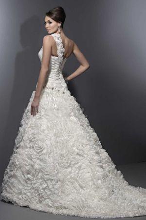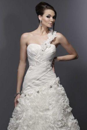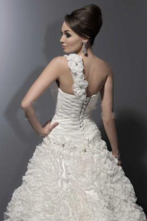This unique one-shoulder delicate frock will lead you to fashion trend. Floral belt sweeps from central front to the shoulder. Shirrs in patterns clasp the bodice until asymmetric waistline. Ruffle rosette appliques densely adorn on skirt like a flower sea adding sweet flavor.