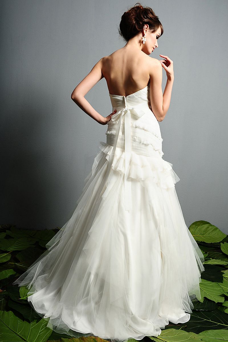 2012 Modern Dramatically Strapless Wedding Gown Dress 1404.Modern strapless gown in Chiffon and Soft Net featuring a dramatically hand-draped natural waist bodice with sweetheart neckline. The entire fit and flare gown has been hand-draped throughout with a soft net overlay, and leads into a soft A-line skirt of chiffon and soft net ruffles. A detachable belt and flower accent the natural waist.