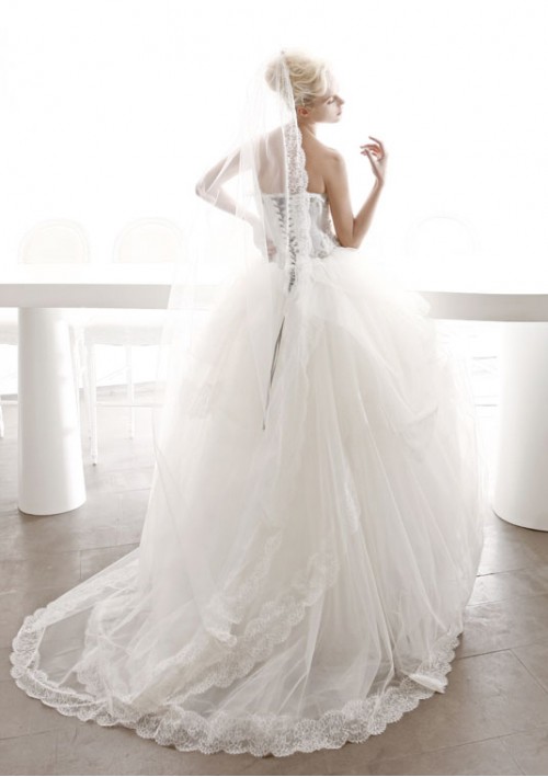 Special Details:Beaded lace appliqued bodice,corst back design and ruffled skirt with chapel train.