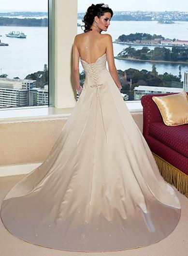 This is a casual champagne a line wedding dress whith is a perfect choice for a beach wedding or other outdoor wedding ceremony. This dress is beautiful dress with no straps but exquisite embroidery on the neck line making the dress more unique . The back is bared to show the sexy back bones. There are natural drapes on the dress which is as beautiful as the subtle waves of the sea.So if you have a sexy back or attractive skin, please try this one.