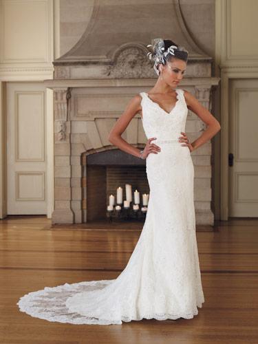 Sleeveless allover lace soft A-line gown, scalloped plunging V-neckline and illusion back bodice, lace bodice with re-embroidered lace motif accented with delicate silver hand-beading, hand-beaded natural waistband, covered buttons cascade down back skirt, lace overlay skirt with scalloped hemline trails into chapel length train.