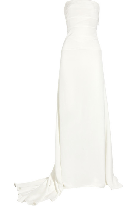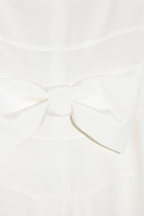 Ivory silk strapless gown with a bow embellishment at back. Valentino gown has a paneled bodice, an internal zip-fastening boned corset, softly folded pleats at back, a draped fishtail, a concealed zip fastening at side and is fully lined. 100% silk. Dry clean.