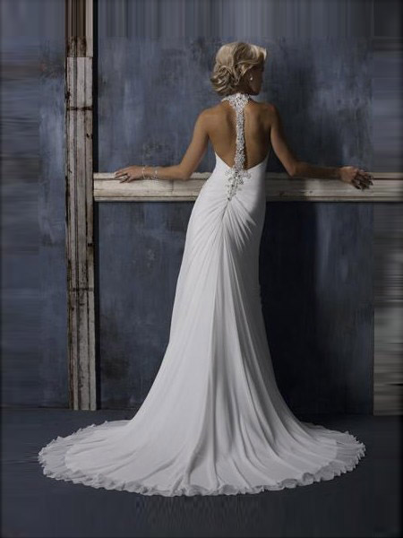 Corset Bodice Exclusive Beaded Halter Strap Pleated Chiffon Sweep/ Brush Length Beach Wedding Dress