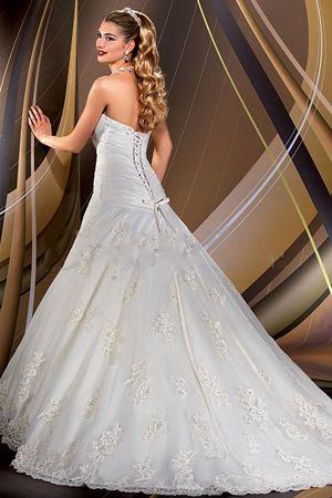 Delicate A-line, topped with sweetheart neckline, ruched details for the bodice produces a textured touch as well as the balanced waist part, flowing out skirt carries floral details and lace bordered hemline for the back view with corset closure complements on the dress glamorously.