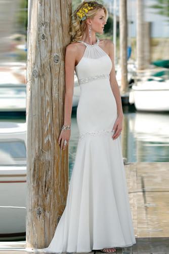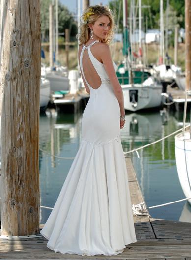 This is a gorgeous white a line wedding dress whith is a perfect choice for a beach wedding or other outdoor wedding ceremony. This dress is very unique for the straps which is tied together by a silk flower to the one side of the sweetheart neck. There is a broad srap on the empire waist. The vertical waves on the dress is as beautiful as the sea waves. So if you wanna a outdoor wedding, please try this one.