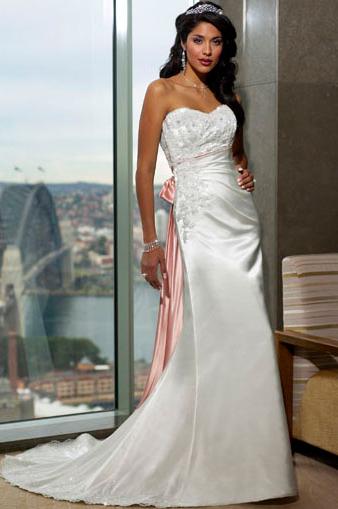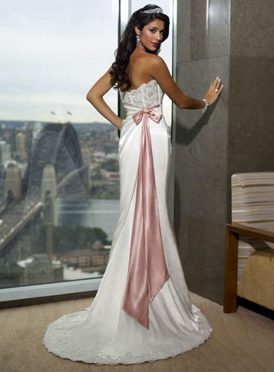 This is a sexy mermaid wedding dress with is a perfect choice for a beach wedding or other outdoor wedding ceremony. This dress is sexy dress with no straps and shallow sweetheart neck cut. There is fine embroidery on the bodice and the back is bared to show the sexy back bones. There is a brown tie on the back waist.So if you have a sexy back or attractive skin, please try this one.