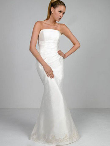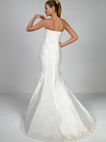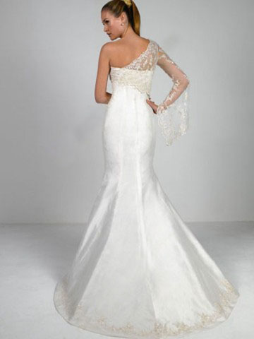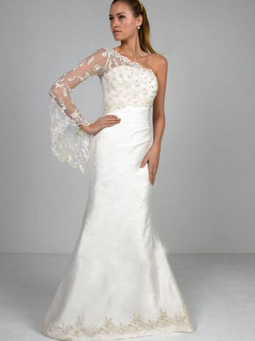 This kind of wedding dress features strapless design,pleated waistline,embroidery and beaded skirt hemline, mermaid trumpet silhouette,made of satin.One shoulder and lace trimmed bolero is included.