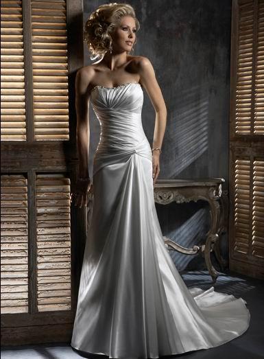 Fitted simple a-line wedding dress features strapless soft sweetheart beading neckline and pleated bodice.A-line skirt with chapel train.