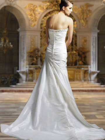This kind of wedding dress features strapless design with embroidery and beading decorated neckline.Beadings and embroidery decorates on the bust.Horizontal pleating encircles on the body-hugging bodice to create a slim look. Flared skirt sweeps on the floor.