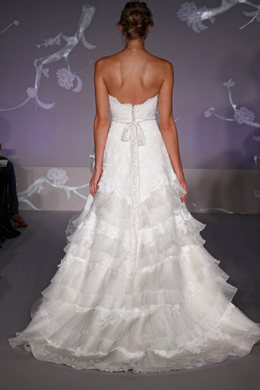 Ivory Sweetheart Lace Pleats Bridal Gown Lz 3102.Ivory tiered pleated silky organza bridal ball gown, lace bodice with sweetheart neckline, sheer net circular ball gown skirt with lace accent and pleated organza tiers, chapel train.