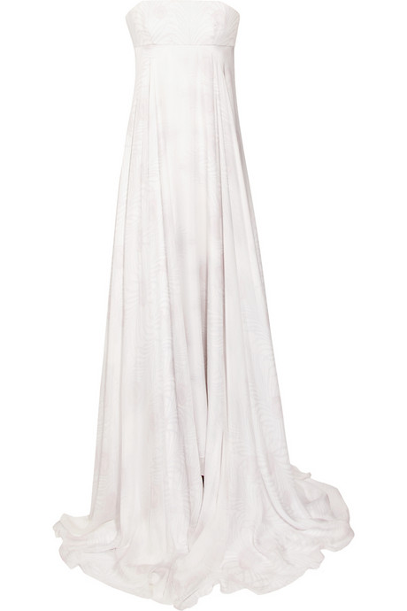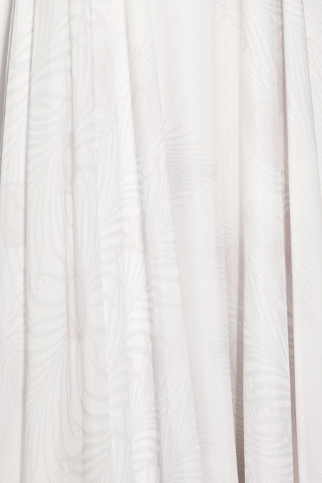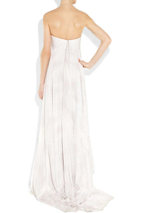 White silk-chiffon strapless gown with a subtle blush and pale-gray peacock print. Matthew Williamson gown has a boned bodice, an empire line, a sash at back, a train with a ruffled hem, a concealed zip and hook fastening at back, and is fully lined. 100% silk; lining: 100% silk. Dry clean. Designer color: Ivory Print.