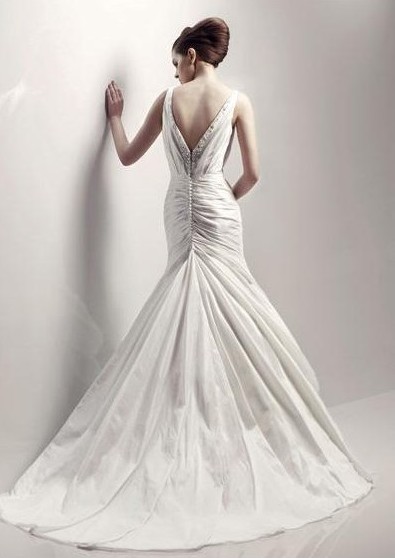 Special Details:Sexy beaded plunged V-Neck, asymmetrically pick-up skirt in chapel train.