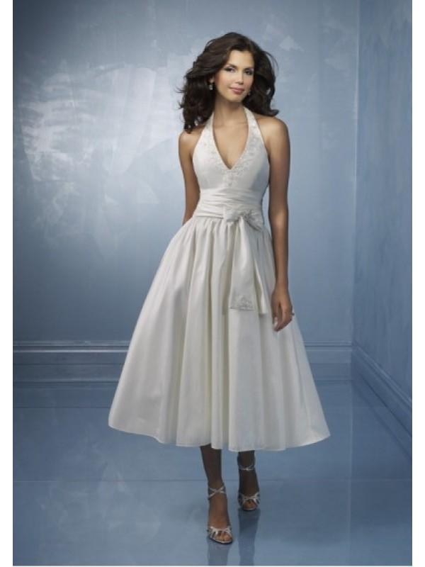 This Short Halter top Tea length Taffeta Sash Princess Designer wedding dress is good choice for beach wedding or any other informal wedding .