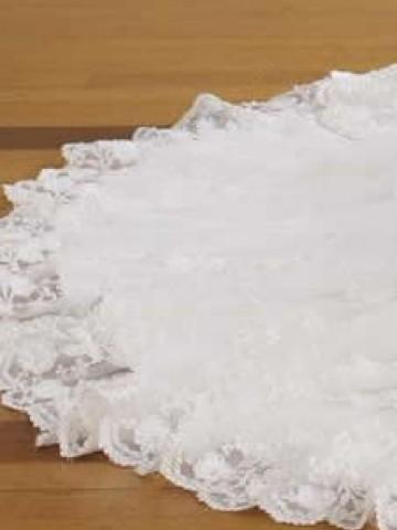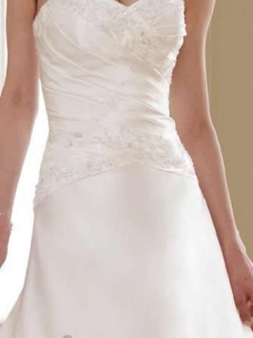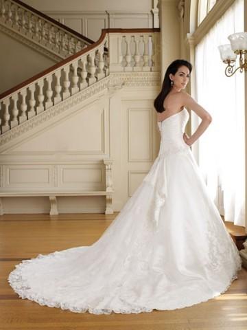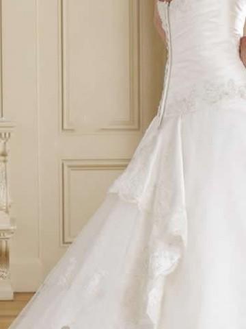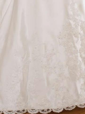 This satin dress is made of satin with a tulle and beaded lace skirt inset at the chapel train.