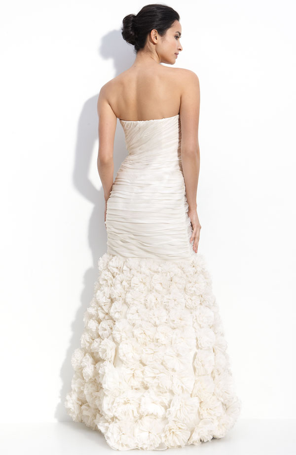 Lush ruching sculpts the curvy silhouette of a strapless silk organza gown. Raw-edge rosettes texture the mermaid skirt that's lined with a tulle crinoline for extra fullness.
