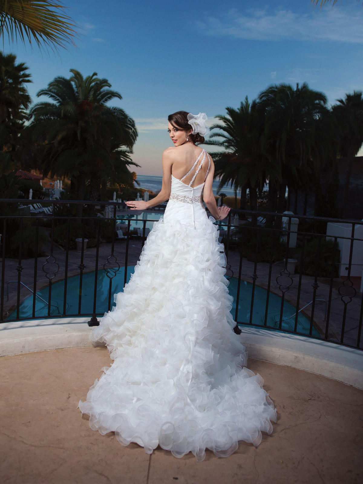 One-shoulder organza A-line gown with modified sweetheart neckline, hand-beaded single strap spills into triple back spaghetti straps, directionally ruched dropped waist bodice with beaded belt at natural waist, full ruffled skirt with cathedral length train.