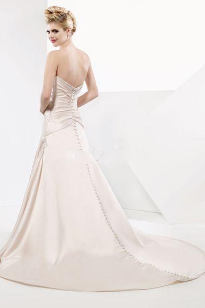 Classic style with modern design offers a sensual look, a great option for the brides. Fantastic strapless bodice with perfectly placed sequin detail provides a great fit. Clingy long dress graceful flows over the body while perfect frills detail defines inverted basque waistline. Buttons run from top to the hemline. Fully lined and sweep train.