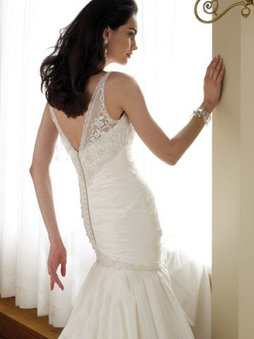 White mermaid V neck beaded straps embroidery taffeta bridal gown