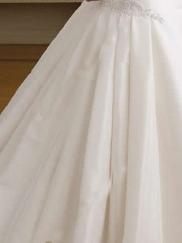 The pleated skirt with beaded motif is pinched at sides, trailling to the back as a chapel length train.