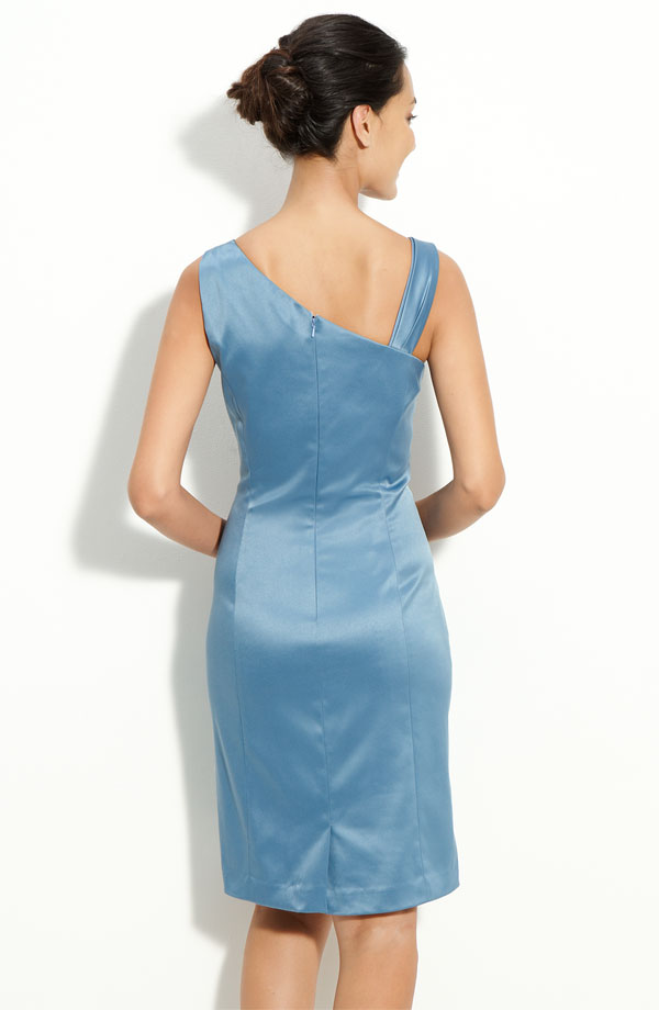 Crisscrossed panels lend figure-flattering definition to a stretch-satin sheath fashioned with an asymmetrical neckline.