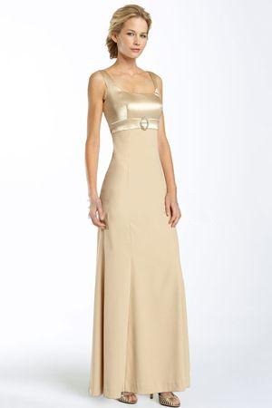 A sparkling rhinestone brooch accents the satin bodice of an elegant gown with a flared crepe skirt. The short-sleeve bolero is fashioned with a dramatic wing collar to frame the face. Dress has back zip with hook-and-eye closure. Wide straps for coverage.