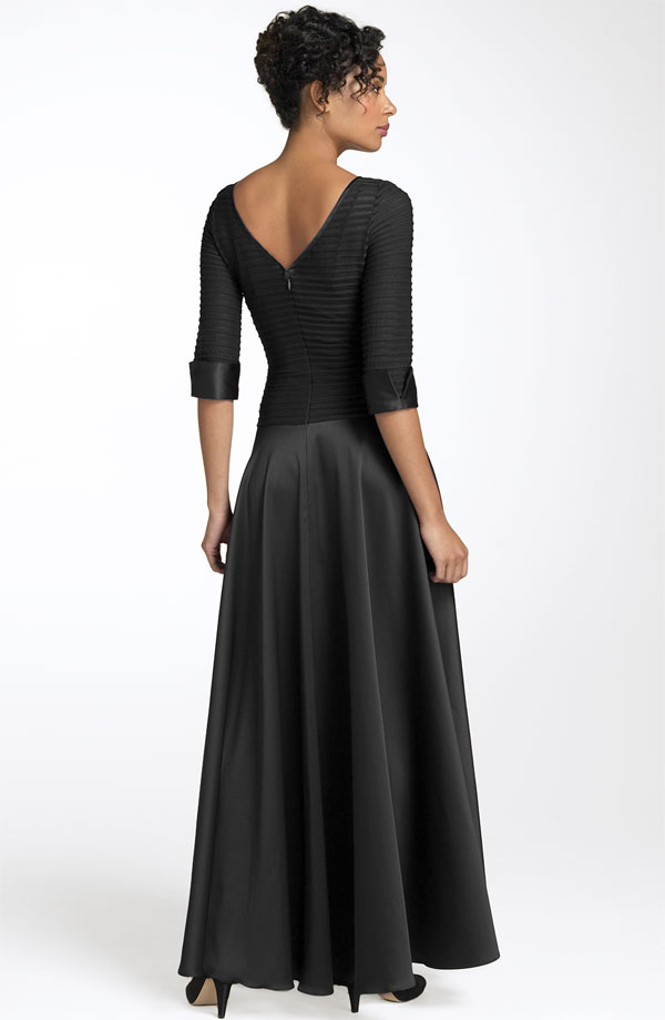 The elegant illusion of two pieces, the ease of one. Lined stretch knit bodice boasts a bateau neckline that falls to a V in back, while sheer, three-quarter-length sleeves end with satin turn-back cuffs.