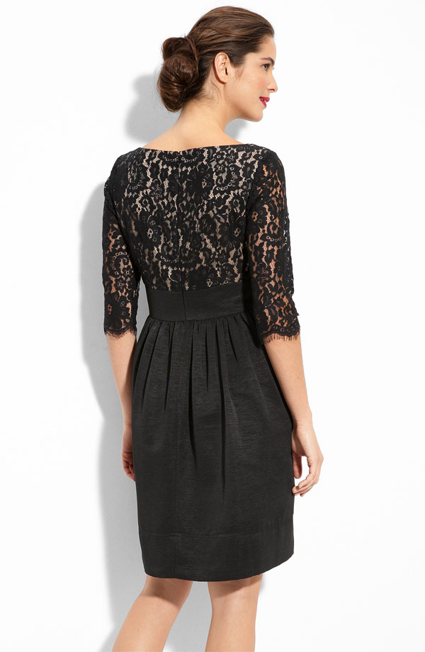 A lace overlay fashions the elbow-length sleeves and V-neck bodice on an Empire-waisted dress with a full faille skirt. Raw-edge fringe on the lace adds to the romantic aesthetic.