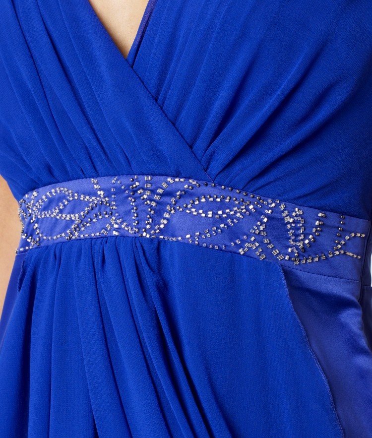Fall in love with this stunning party dress. With a deep v neckline and fitted embellished waist, the style is ultra flattening. Featuring gorgeous drape detailing to give a classic twist. 100% Polyester.