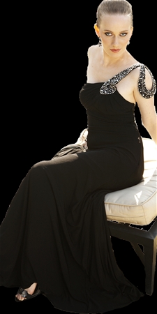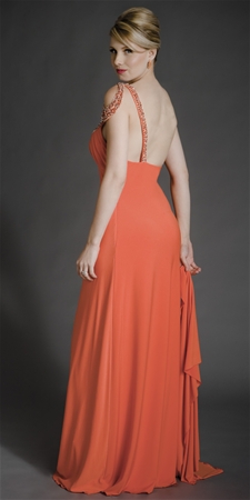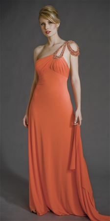 One shoulder beaded jersey long evening dress by Interlude Spring 2011 collection. This style comes in two different colors: Black and Orange.. For a perfect fit have your measurements compared with the size chart.