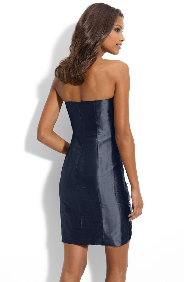 A beautifully textured dress is fashioned with a swath of square organza appliqués sweeping across the front, many secured by a single metal bead.