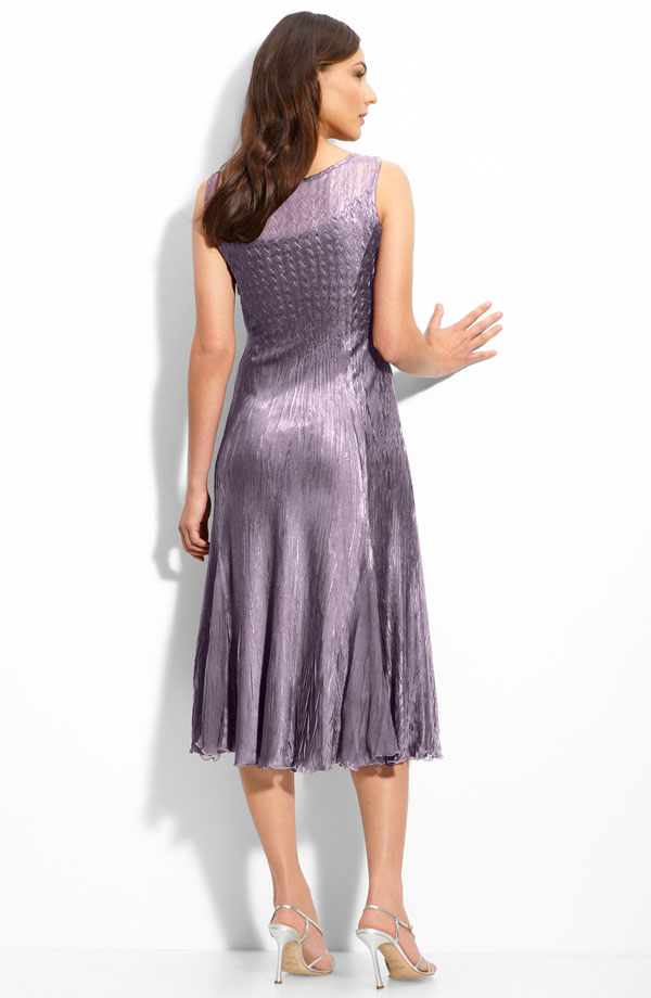 Diamond-pleated chiffon tops a lustrous sleeveless dress fashioned with sheer insets at the hemline. A beautifully jeweled snap secures the V-neck jacket, which features sheer three-quarter-length sleeves and a tiered, raw-edge hem.