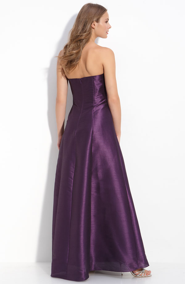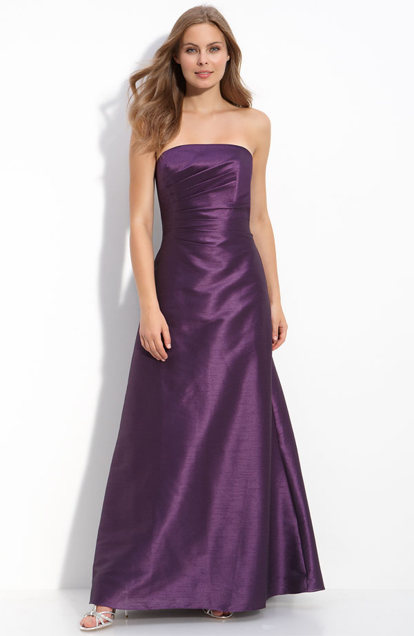A fan of pleats shapes the bodice of a strapless gown with a flattering A-line skirt.