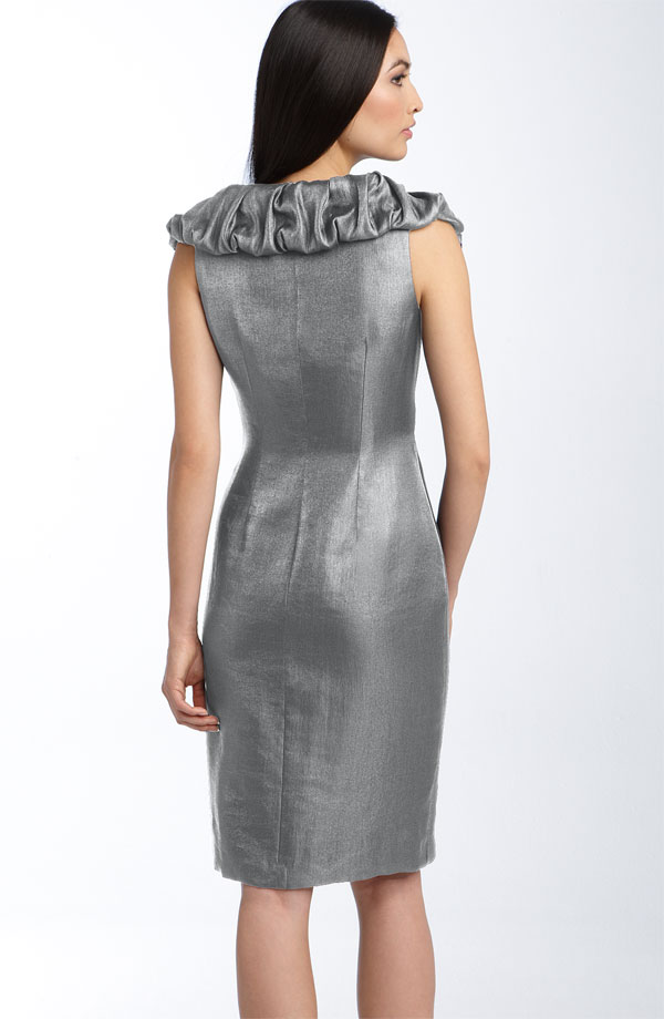 A dramatically ruched portrait collar sets off the elegant style of a slender sheath in lustrous taffeta, designed with off-center ruching through the waist for a flattering fit.