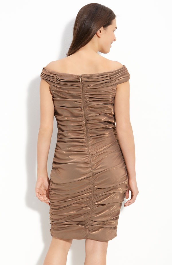 A beaded tulle-and-feather flower accents the pleated off-the-shoulder neckline of a shimmery stretch satin dress that's ruched for a flattering fit.
