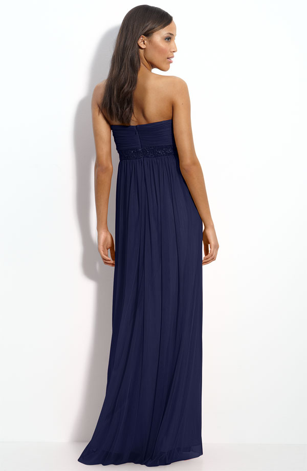 Beads and sequins shimmer along the Empire waistline of a floor-sweeping gown fashioned with multidirectional ruching at the sweetheart bodice.
