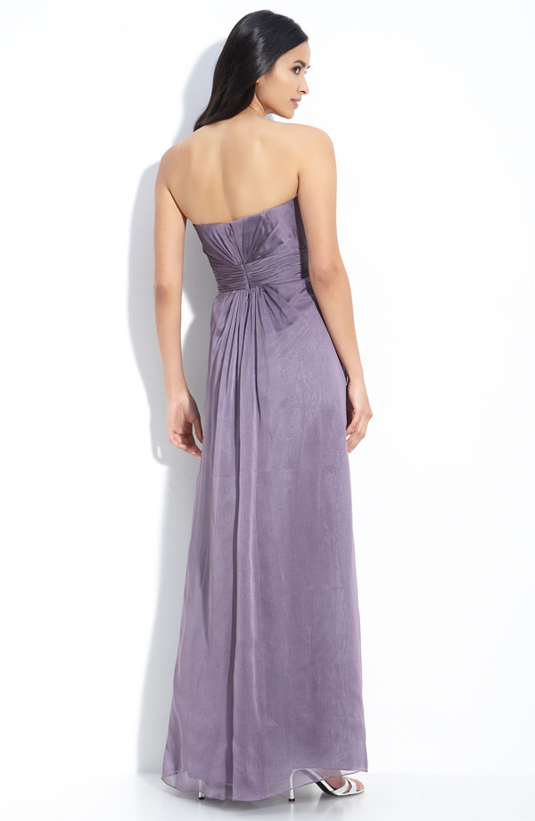 Radiating front and back pleats shape the sweetheart bodice of a shimmering chiffon gown defined by a densely ruched sash at the Empire waist.