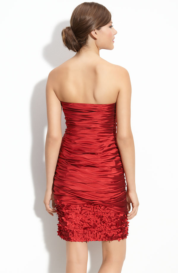 A beautifully pleated dress with a sweetheart neckline features scattered floral cutouts near the hem.
