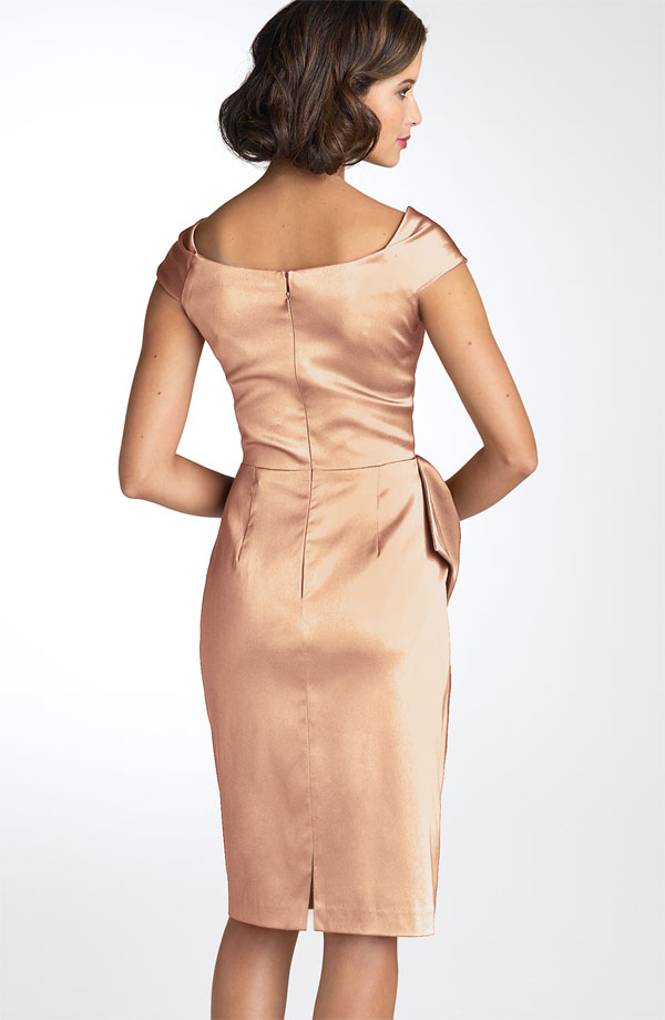 Wide portrait neckline and beautifully styled faux-wrap skirt with a stitched cascade at one side give a stretch-satin sheath an elegant silhouette.